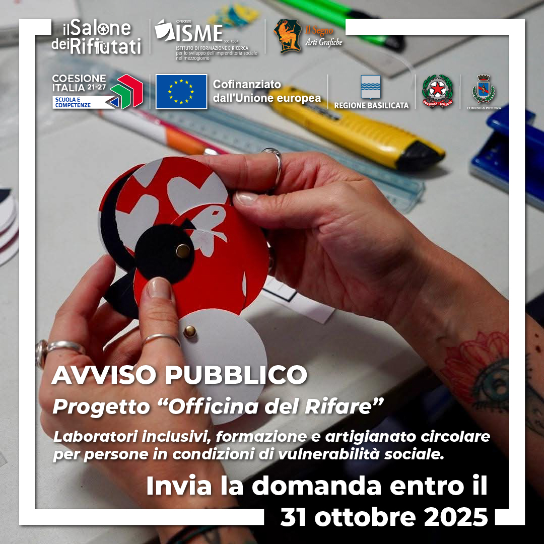 La Cooperativa Sociale Il Salone dei Rifiutati, insieme ai partner Consorzio ISME e Cooperativa Il Segno Arti Grafiche, avvia il progetto “Officina del Rifare”, finanziato dalla Regione Basilicata nell’ambito dell’Avviso “Proposte innovative finalizzate alla creazione di percorsi di accompagnamento a persone in condizioni di vulnerabilità sociale – edizione 2024”.